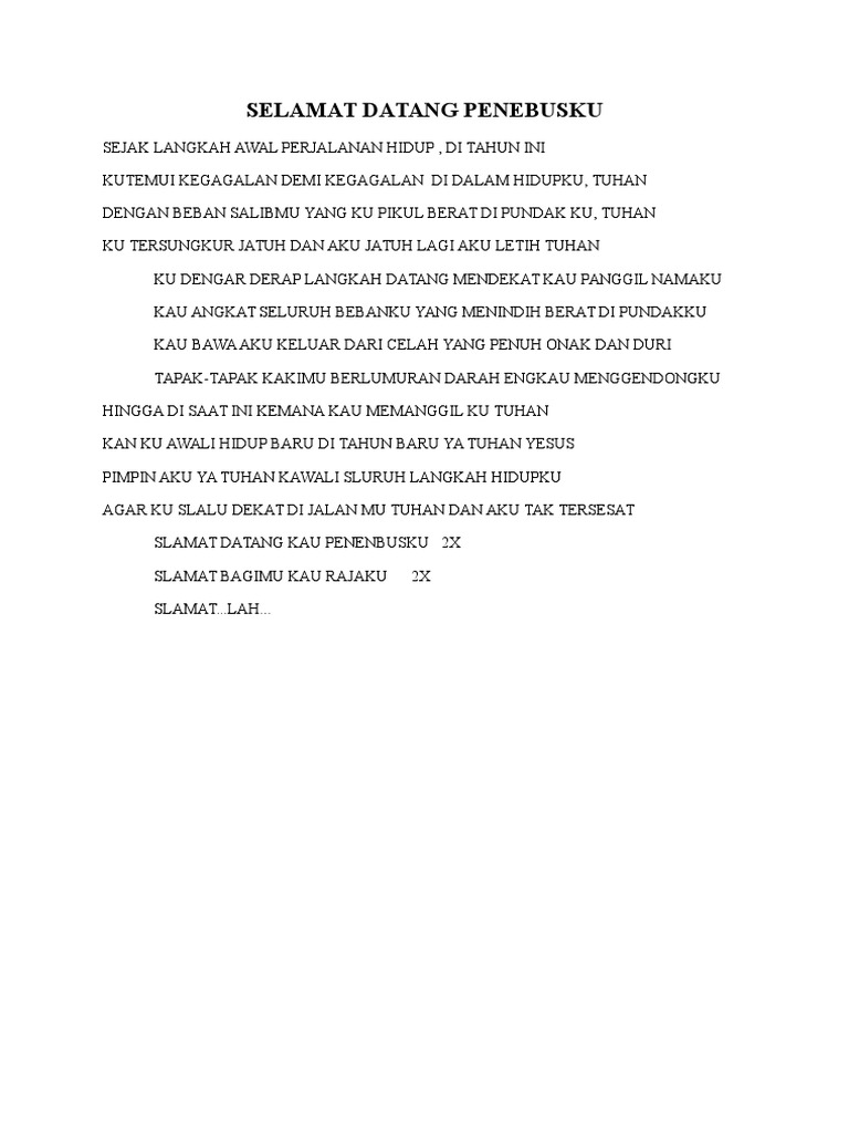 DAN KU AWALI HIDUP BARU DITAHUN BARU YA TUHAN YESUS TUNTUN AKU YA TUHAN KAWALI SLURUH LANGKAH HIDUPKU AGARKU SLALU DEKAT DIJALAN-MU TUHAN DAN AKU TAK TERSESAT SELAMAT DATANG KAU PENEBUSKU SELAMAT BAGIMU KAU RAJAKU SELAMAT DATANG KAU PENEBUSKU SELAMAT BAGIMU KAU RAJAKU SELAMATLAH. Ari Sapulete Nada Dasar D. Tuhan Kutersungkur jatuh dan aku jatuh lagi Aku letih Tuhan Verse 2 Kudengar derap langkah datang mendekat Kau panggil namaku.